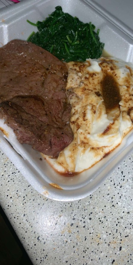 While My Steak Was Resting I Finished Up My Spinach & Made A Light Gravy Out of Some Extra Butter, Steak Drippings From The Pan, & A Tad Bit of Water. I Stirred it Real Well Making Sure to Kinda Blend Some of The Seasonings From the Bottom of The Pan but Was Careful Not to Scrape it Too Much. My Mashed Potatoes Were Not Homemade. As Stated in A Previous Recipe, My Usual Go to is Bob Evans Mashed Potatoes & With Some Added Butter & Pepper They Taste Just As Amazing.